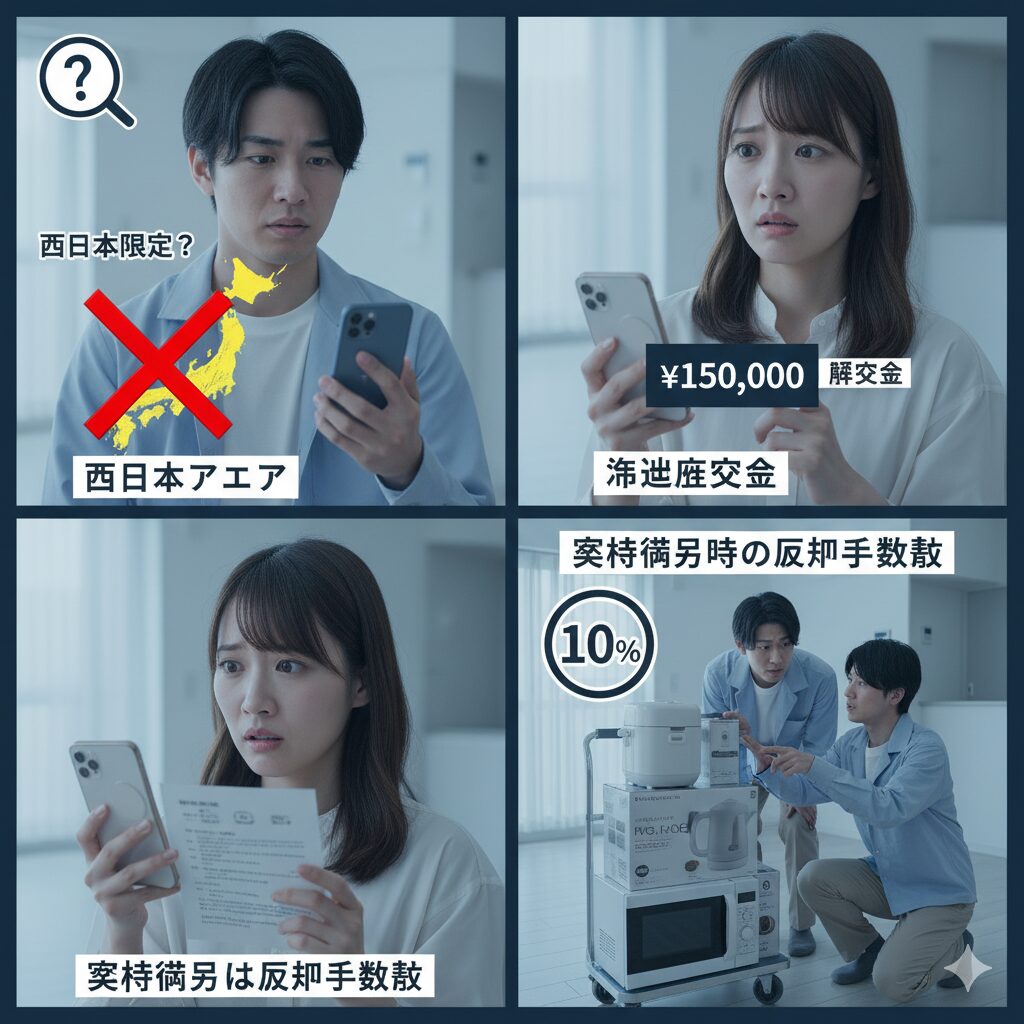 ラクリアーズには「すべて新品」という大きなメリットがありますが、その前に知っておくべき「契約上の注意点」がいくつかあります。特に「やばい」と感じる可能性があるのは、契約期間と解約金、そして配送エリアの問題ですね。これらを知らずに契約すると「こんなはずじゃなかった」となりかねないので、しっかり確認しておきましょう。