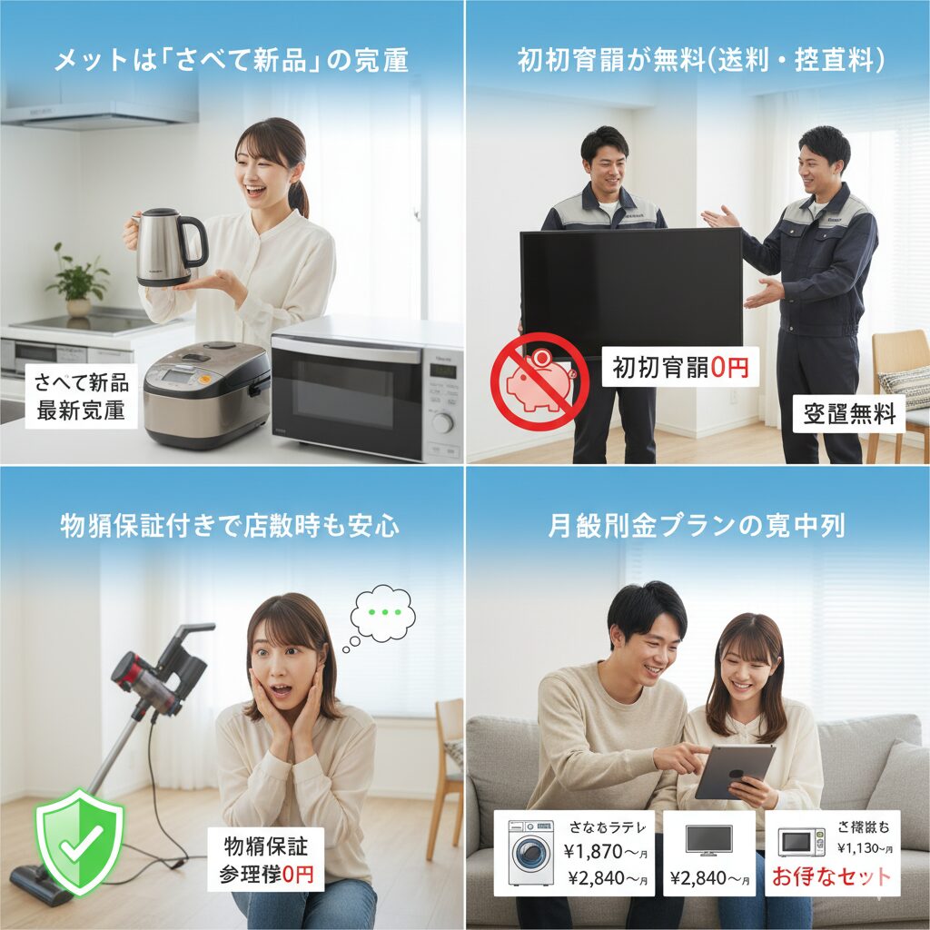 家電サブスクリプション自体は便利なサービスですが、各社で特徴がかなり異なります。この記事では、ラクリアーズの利用を検討している方が契約後に後悔しないよう、メリットはもちろん、デメリットやリスクについてもしっかり掘り下げていきますね。